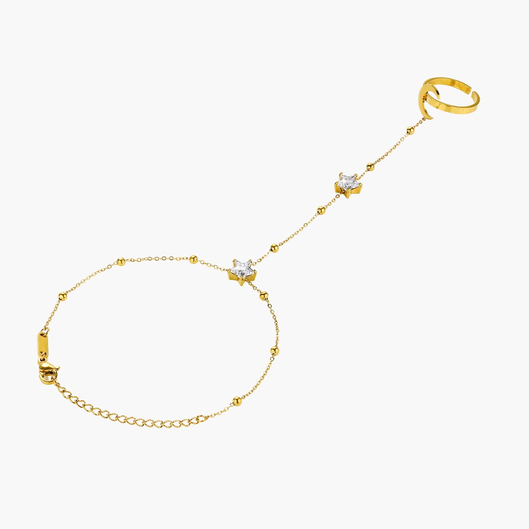 This delicate chain bracelet features a celestial star and moon charm with a refined extension that loops gracefully around the finger, creating a seamless hand chain effect.